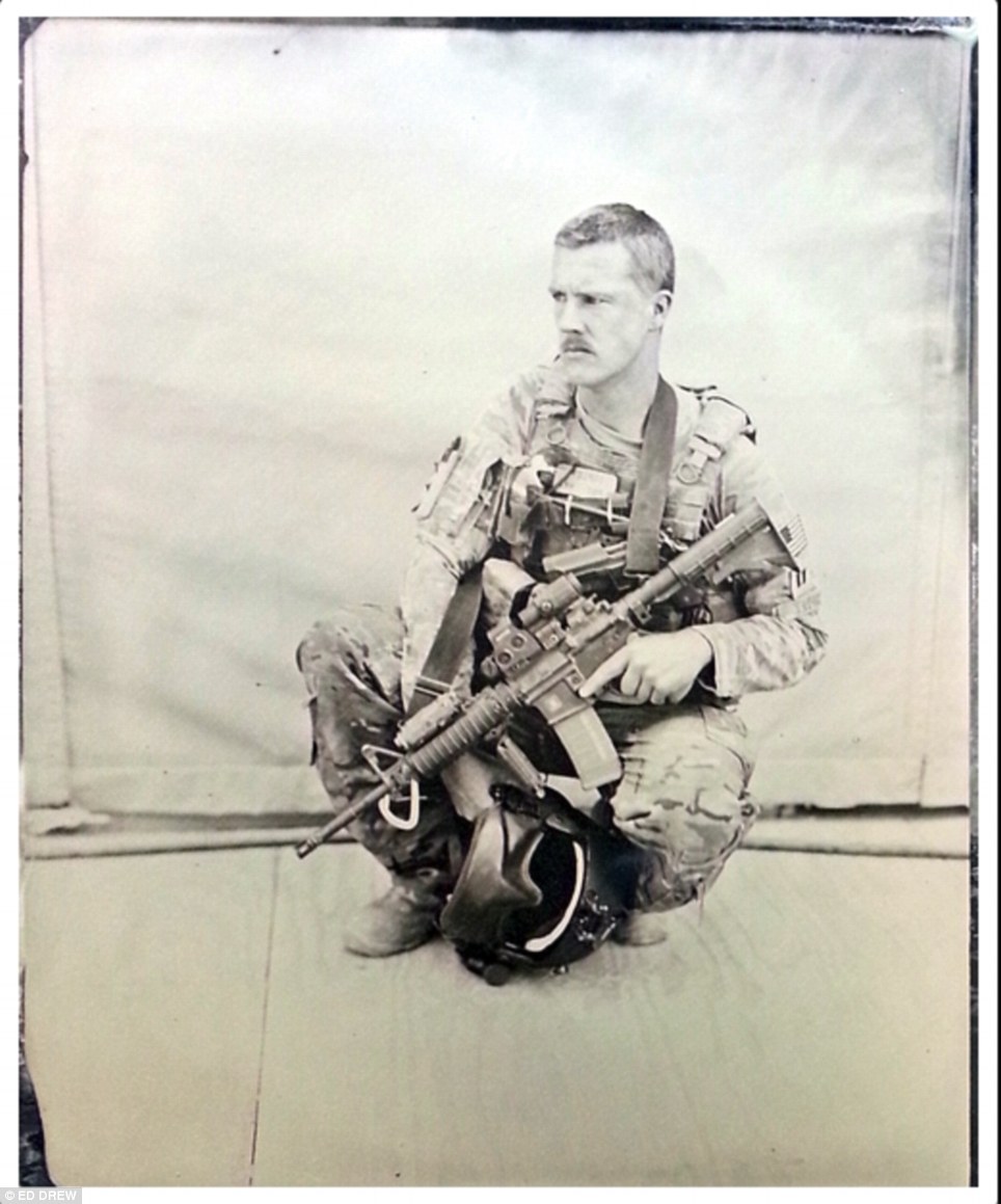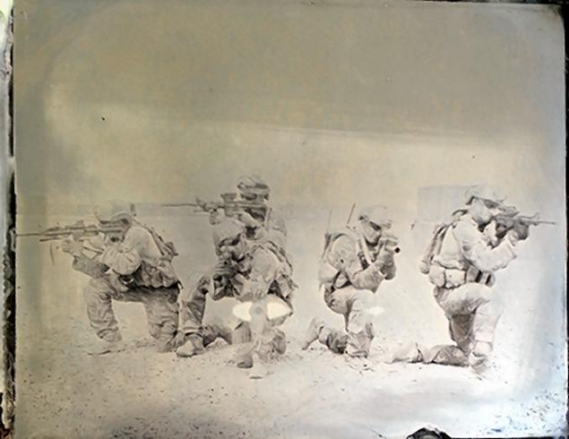 Ed Drew is a US Air Force staff sergeant who is receiving publicity for his arresting photographs of fellow members of his helicopter squadron in Afghanistan. He speaks engagingly about his photos and views on art at this link, and he maintains a blog that features his photography before, during, and after his deployment as well as his poetry. Most remarkable about his Afghanistan photos is that they are “tintypes” or “wet plates”—a technique employed by Civil War photography pioneers such as Mathew Brady, but one that is far too cumbersome to be practical these days. Drew’s inspired decision to shoot using such archaic technology lends his subjects a timeless, stately, and elegiac feel. Because the photos depend on such long exposure and development times, they convey deep stillness and penetration, as if their subjects gave up more and more of their souls the longer the camera lingered. The choice of medium connects contemporary service with older traditions uncomplicated by problems associated with modernity, and suggest that soldiering is experienced and understood individually and in small units, shorn of global politics and large-scale social consequences.