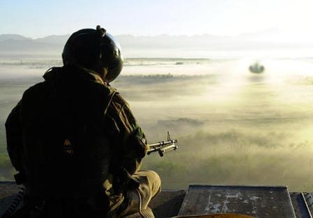 In a sense I’m suggesting that the pictures have become a generic Afghanistan motif, but, still, the photos are always striking, what with the bulb-headed helmeted soldier, framed in the door hatch, hanging precariously off the back lip of an aircraft flying over a scenic Afghanistan rural or urban locale. The pictures evoke equal amounts of tension, serenity, wonder, thoughtfulness, and thrill, which in my experience are the same emotions that come with actually flying in a Chinook while looking backward over an open ramp.