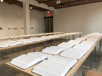 A few large-scale installations work hard to impress themselves upon viewers. “Untitled (Iraq Book Project),” for example, by Rachel Khedoori, features everything available on the Internet about the Second Iraq War printed out and presented for inspection in bound volumes. The piece seems to speak to the over-saturation of words about the war and the strained effort to find words equal to the real events, anguish, and loss on the ground.