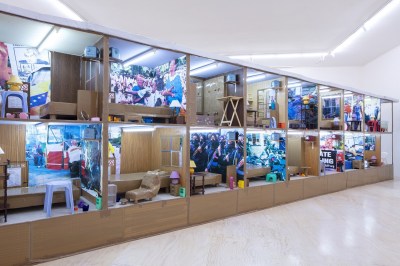 Another piece, “Hotel Democracy” by Thomas Hirschhorn, features twenty-some cubicle like living spaces, some reflective of soldier quarters on military FOBs and others the living spaces of Iraqi civilians hunkered down in tiny rooms, the inhabitants reduced to poverty and trying to survive sans community. The message here seems to address both the drive for individuals to personalize their living spaces in the face of war’s deprivations, while also speaking to the essentially cloistered and unnourishing inhumanity of those same living spaces.